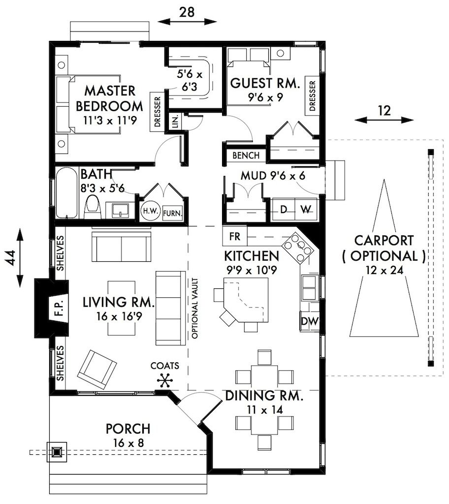 Modern cottage farmhouse floor plan with 1616 square foot with 2 bedrooms and 2 bathrooms. This house plan is also ideally suited for a narrow property lot set deep in the woods or on a lakefront property lot with a 34 width dimension. The best 2 bedroom house plans.