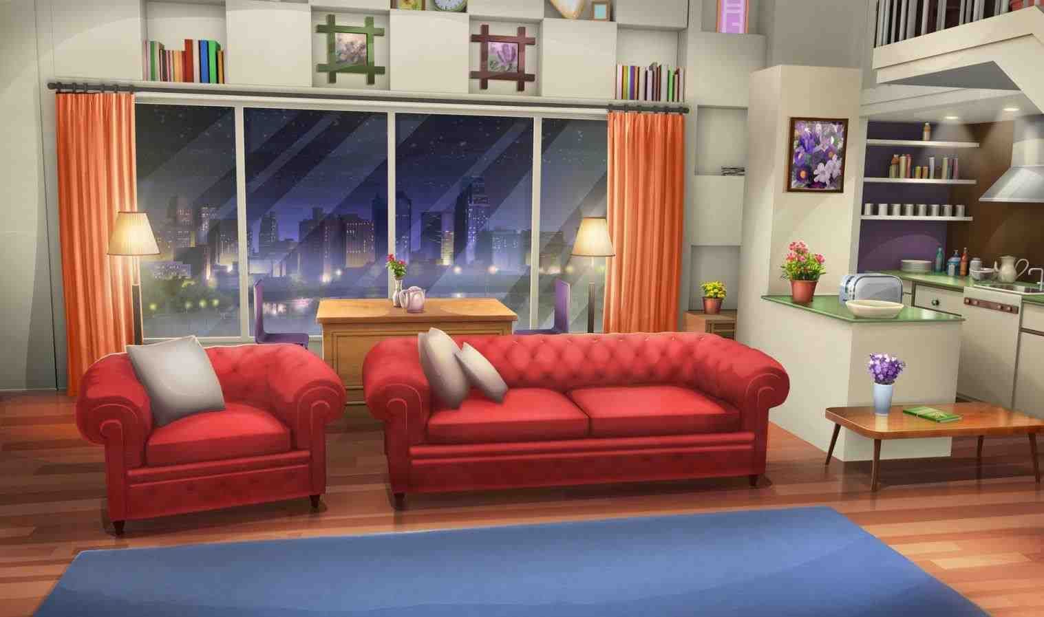 Interior blank photo frame living room with white sofa. Visual novel background tumblr. Living room interior with fabric armchair lamp book and plants on empty yellow wall background.