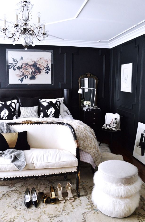For the master bedroom in her 1920s chicago penthouse alisa bloom embraced a dark palette choosing walls sheathed in a black holland sherry fabric. Dark room colors and vibrant wall paint changing interior dimensions visually. Along with unsigned artwork from redefined chicago the space features a b b italia bed in a holland sherry wool a desk by lucien rollin and a chair by oscar de la renta for century.